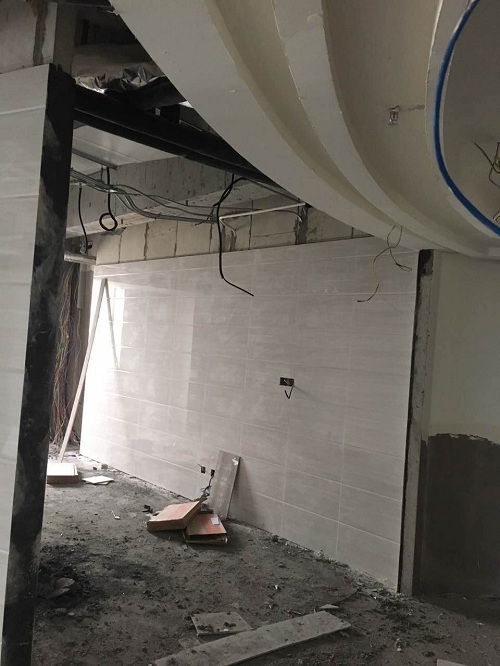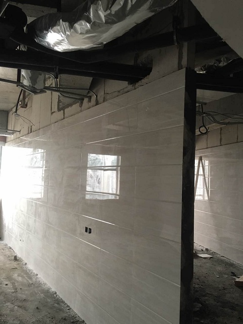 下圖是三峽大學仁和醫(yī)院輕質隔墻板完工后貼瓷磚的現場圖