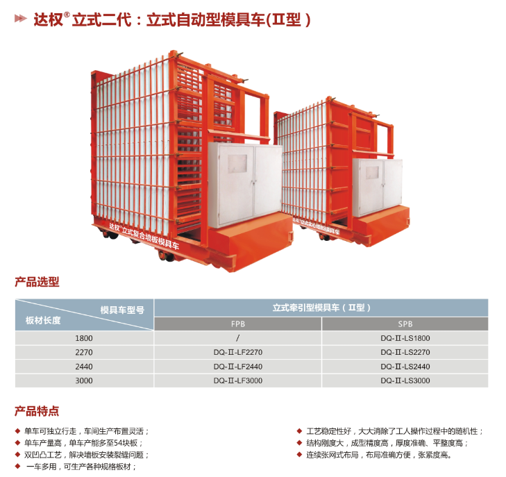 達(dá)權(quán)復(fù)合夾芯板立式模具車是達(dá)權(quán)首創(chuàng)的立式模具車,用于生產(chǎn)輕質(zhì)復(fù)合夾芯板,改變了傳統(tǒng)的臥式模具車生產(chǎn)形式,相對于傳統(tǒng)復(fù)合夾芯板臥式車,立式模具車更利于倒模拆模,大大提高了生產(chǎn)效率,降低了人工成本。性能已達(dá)到國際同類產(chǎn)品的領(lǐng)先水平。免費(fèi)提供本公司品牌、商標(biāo)、工藝流程的技術(shù)培訓(xùn),為建廠公司(合作廠家)全方位提供生產(chǎn)、安裝、銷售的扶持及服務(wù)。