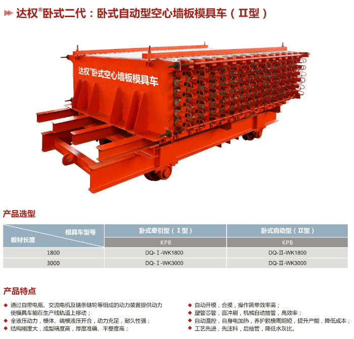 臥式空心板模具車可以生產(chǎn):空心條板(KPB)。模具車是輕質(zhì)條板生產(chǎn)線主要組成部分,生產(chǎn)線的產(chǎn)量主要由模具車數(shù)量的多少確定。在確定生產(chǎn)線之后最經(jīng)濟(jì)實(shí)惠的生產(chǎn)工具之一,能顯著的提高產(chǎn)能,是擴(kuò)大生產(chǎn)的一大利器。免費(fèi)提供本公司品牌、商標(biāo)、工藝流程的技術(shù)培訓(xùn),為建廠公司(合作廠家)全方位提供生產(chǎn)、安裝、銷售的扶持及服務(wù)。